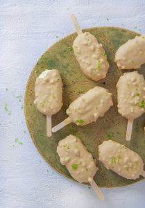 Limeisen kan serveres som den er, eller bruges som tilbehør til fx. et stykke kage eller tærte. Den kan også fryses ned i is-formede silikoneforme og dyppes i tempereret chokolade når de er helt frosne. Her er de dyppet i karamelliseret hvid chokolade med hakkede ristede hasselnødder.