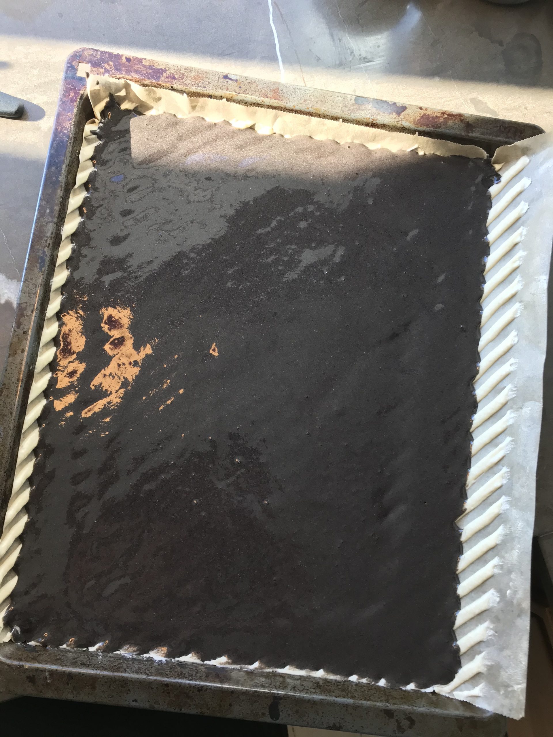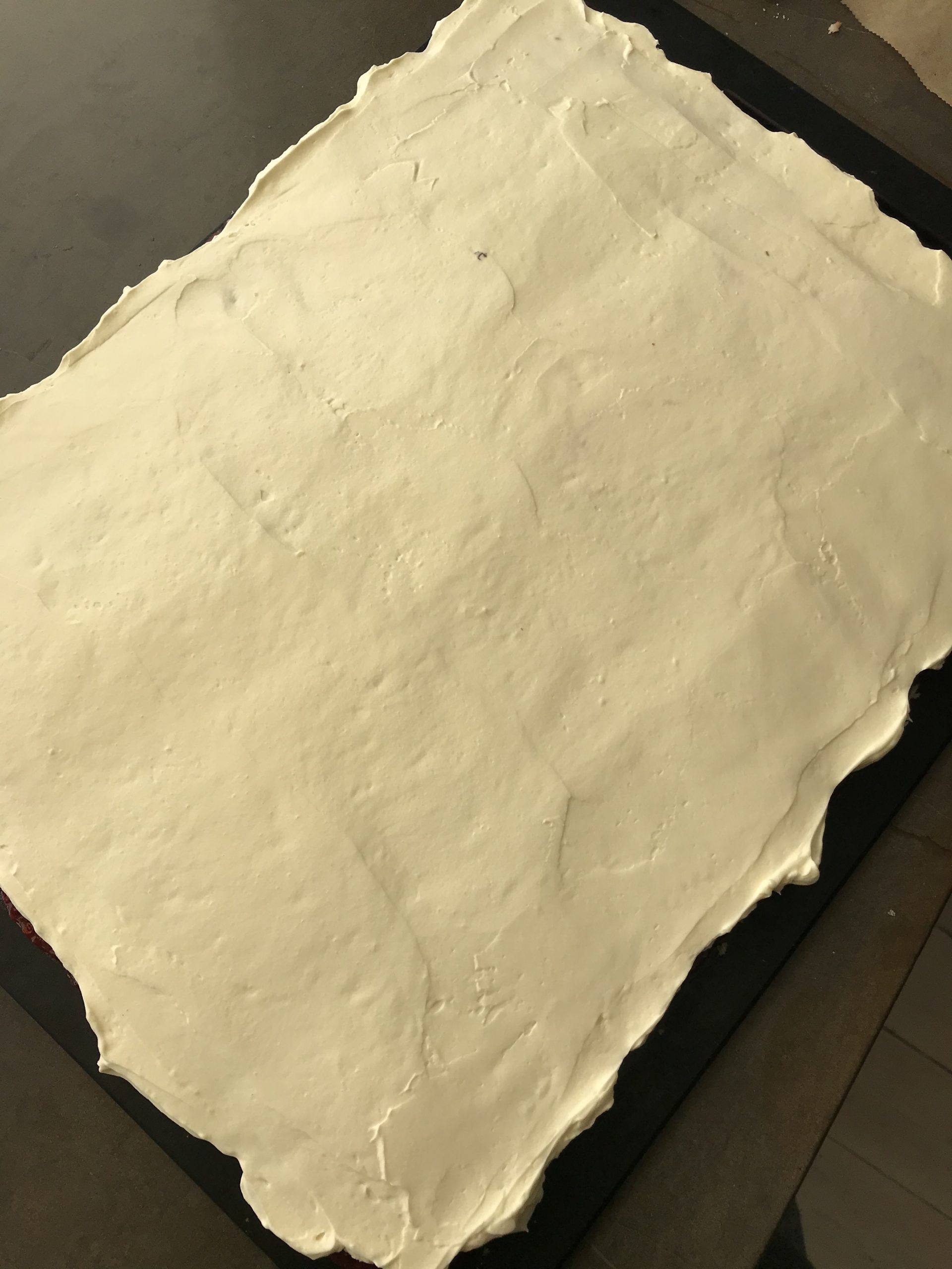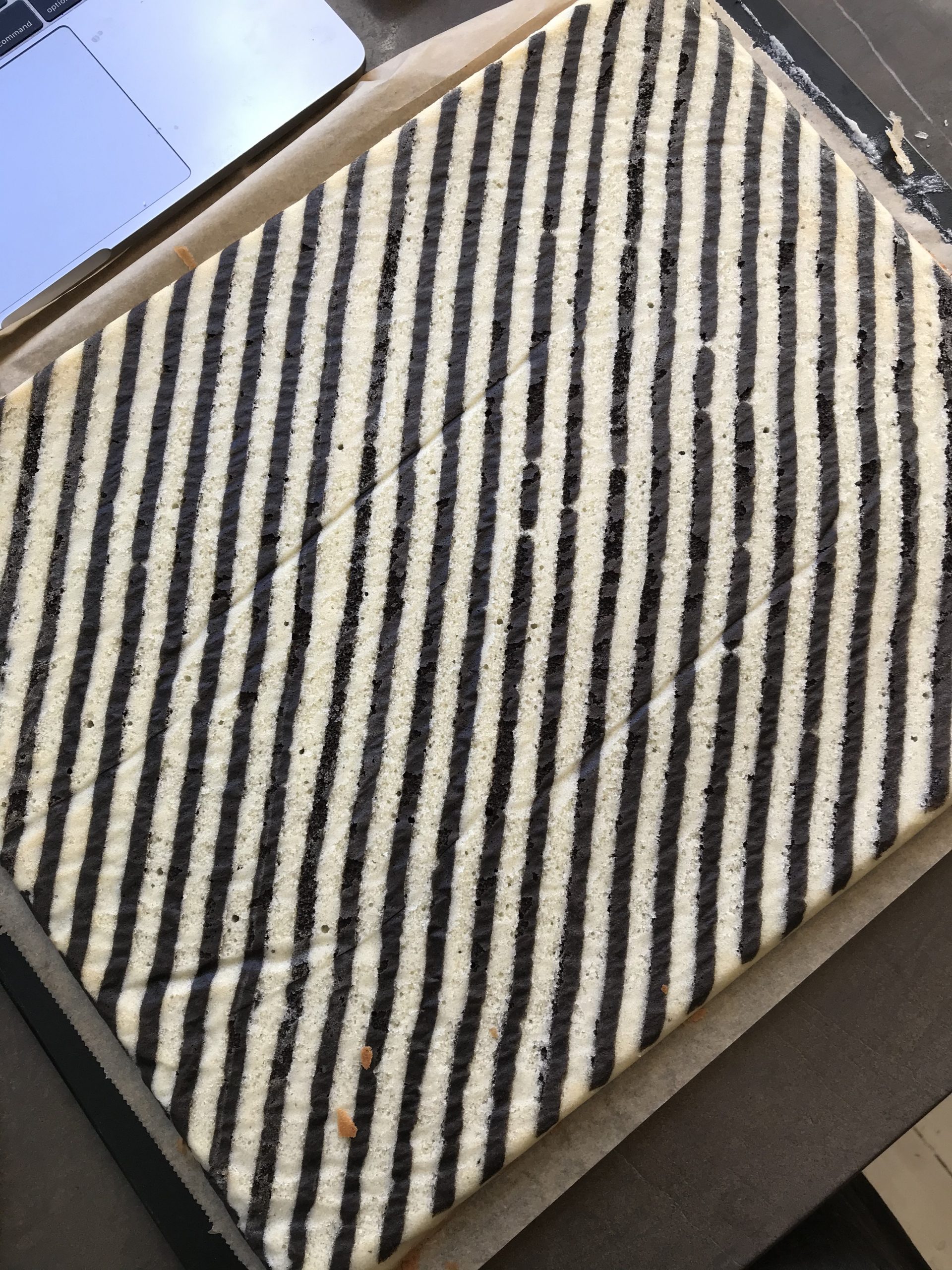 Del æggene i blommer og hvider. Pisk æggeblommerne og halvdelen af sukkeret til en lys og luftig æggesnaps. Blend mandler og de resterende tørre ingredienser til helt fint mel og vend det nænsomt i æggesnapsen. Pisk æggehvider og det resterende sukker til en fast marengs og vend den i dejen lidt ad gangen. Smør forsigtigt dejen ud oven på de frosne hvide striber og bank pladen mod køkkenbordet for at undgå luftbobler og huller i mønstret. Bag bunden ved 175° varmluft i ca. 10-12 min til dejen springer tilbage ved let tryk. Tag bunden ud og lad den køle helt af med et stykkebagepapir og et skærebræt lagt oven på den, så den bliver helt plan.
