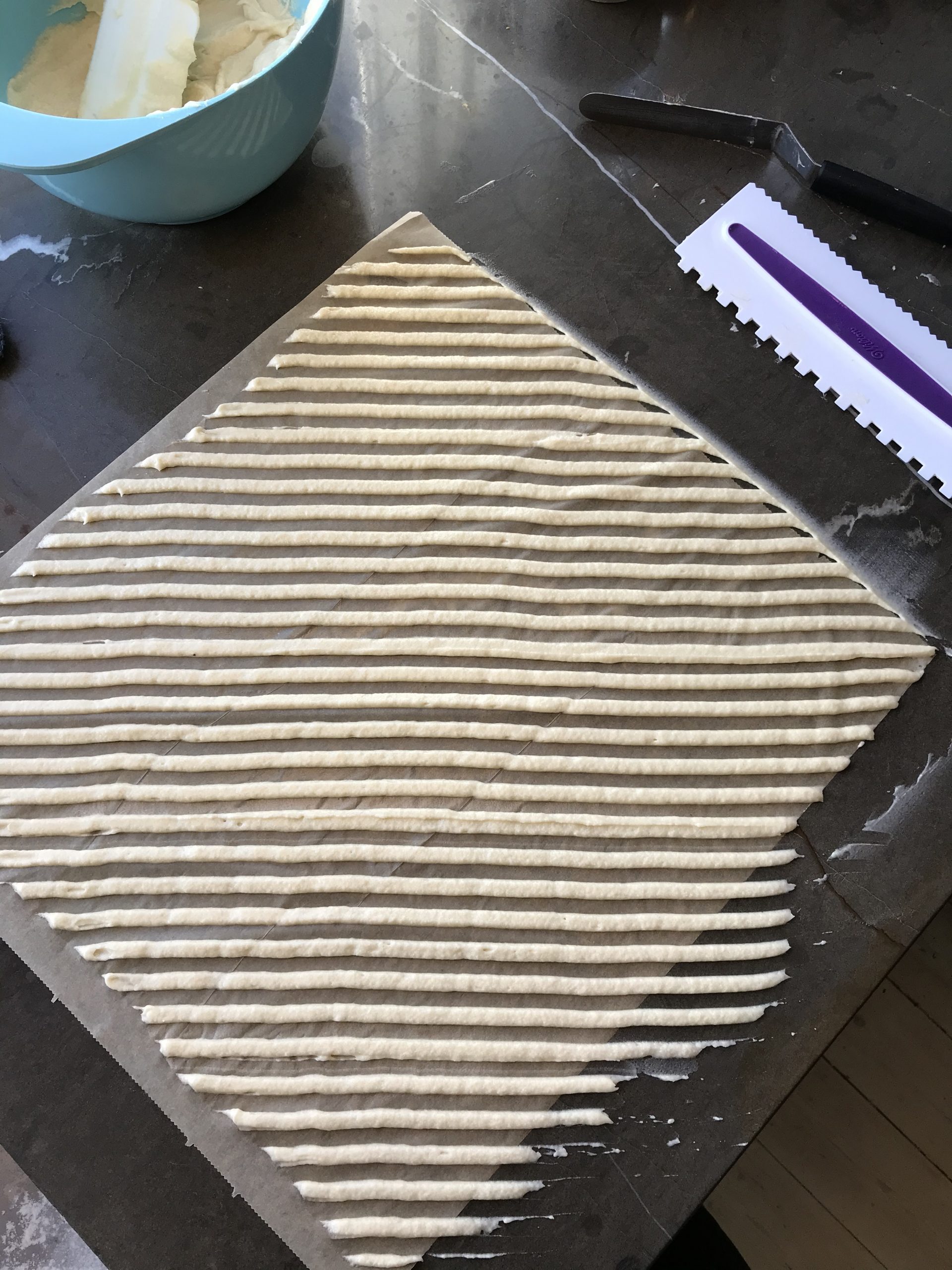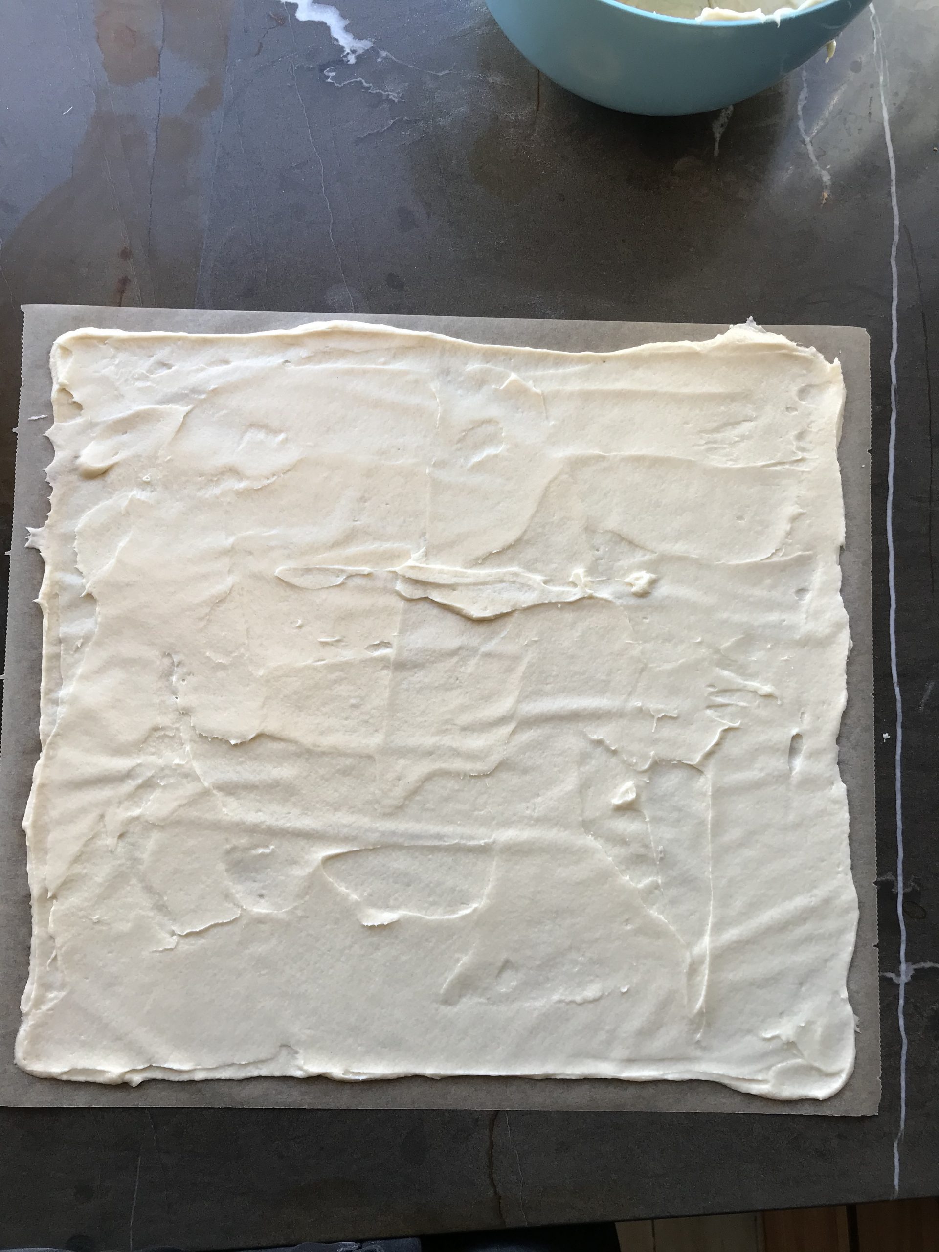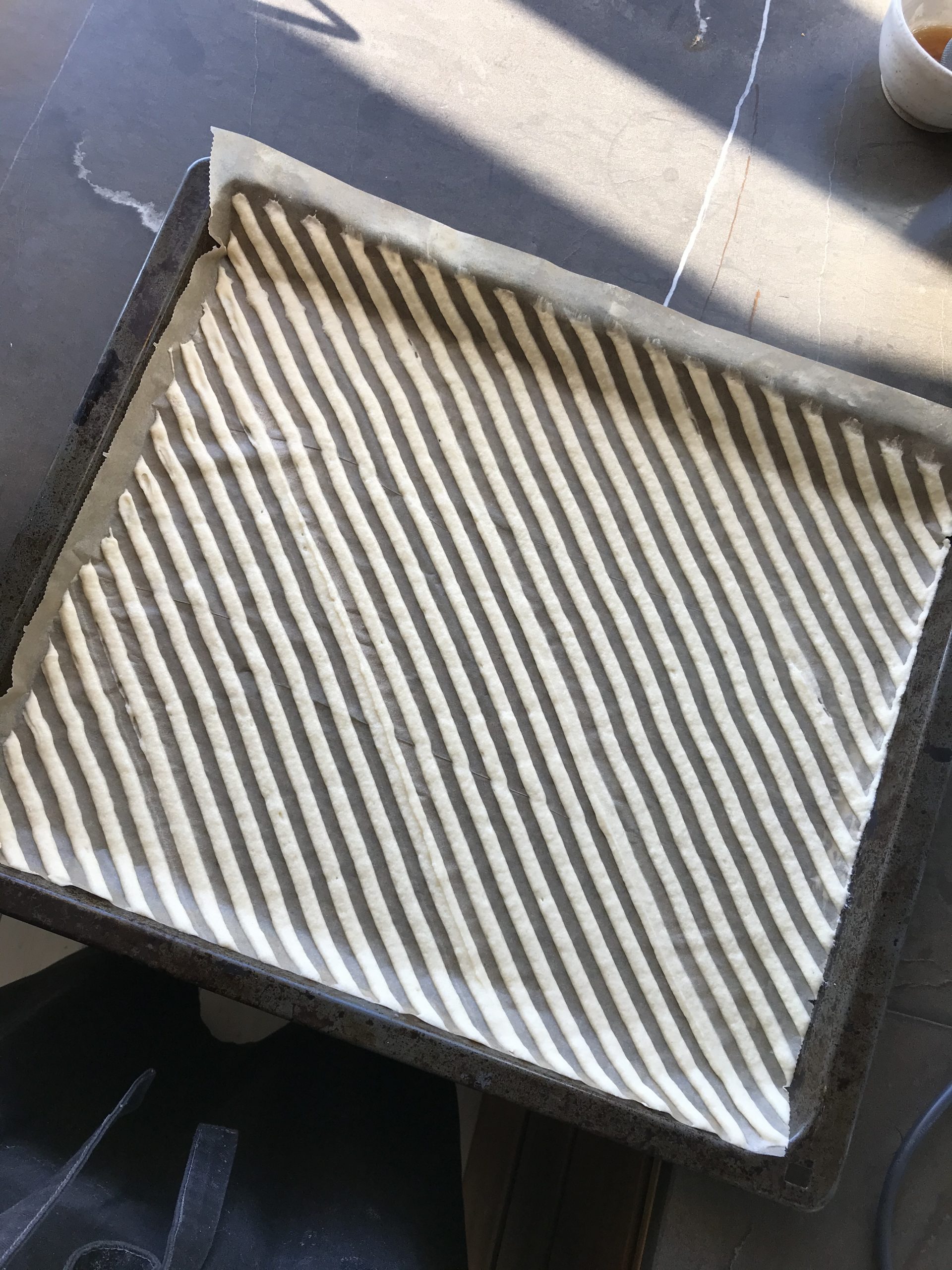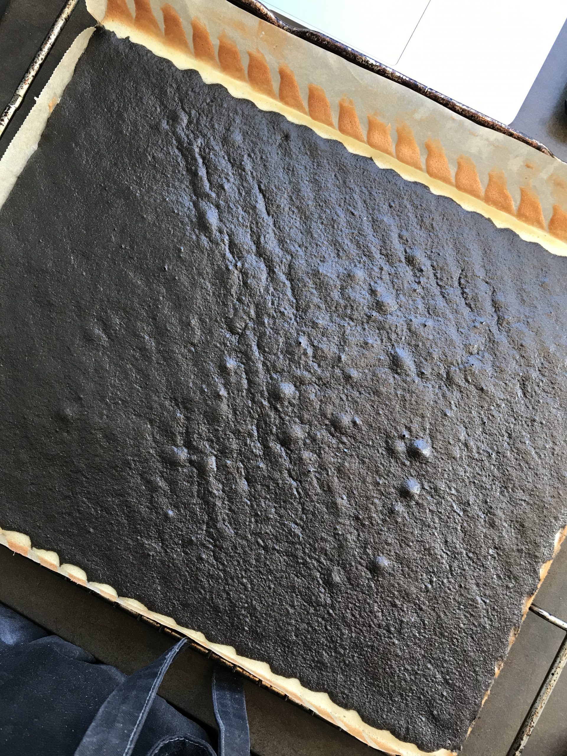 Del æggene i blommer og hvider. Pisk æggeblommerne og halvdelen af sukkeret til en lys og luftig æggesnaps. Blend mandler og de resterende tørre ingredienser til helt fint mel og vend det nænsomt i æggesnapsen. Pisk æggehvider og det resterende sukker til en fast marengs og vend den i dejen lidt ad gangen. Smør forsigtigt dejen ud oven på de frosne hvide striber og bank pladen mod køkkenbordet for at undgå luftbobler og huller i mønstret. Bag bunden ved 175° varmluft i ca. 10-12 min til dejen springer tilbage ved let tryk. Tag bunden ud og lad den køle helt af med et stykkebagepapir og et skærebræt lagt oven på den, så den bliver helt plan.