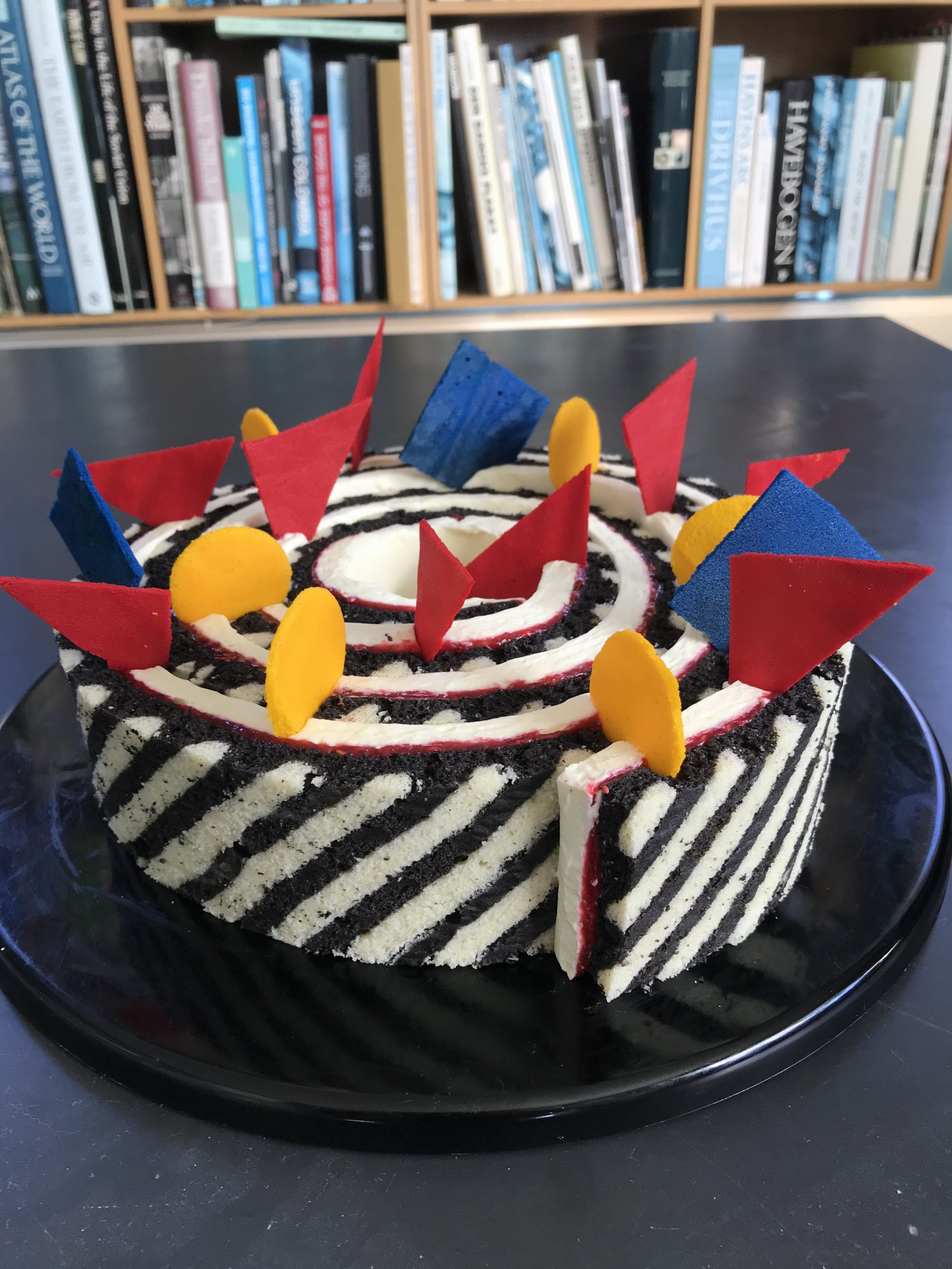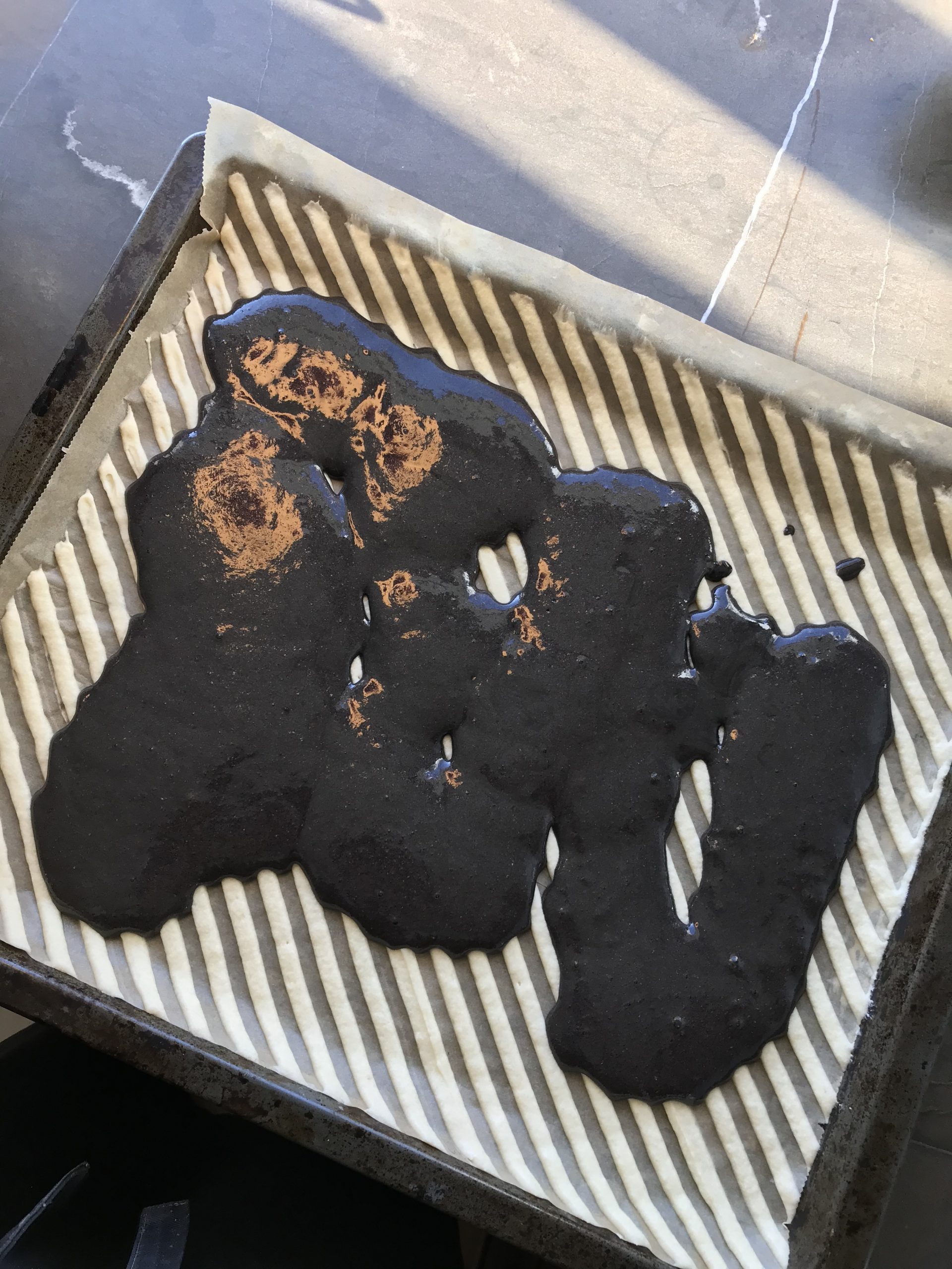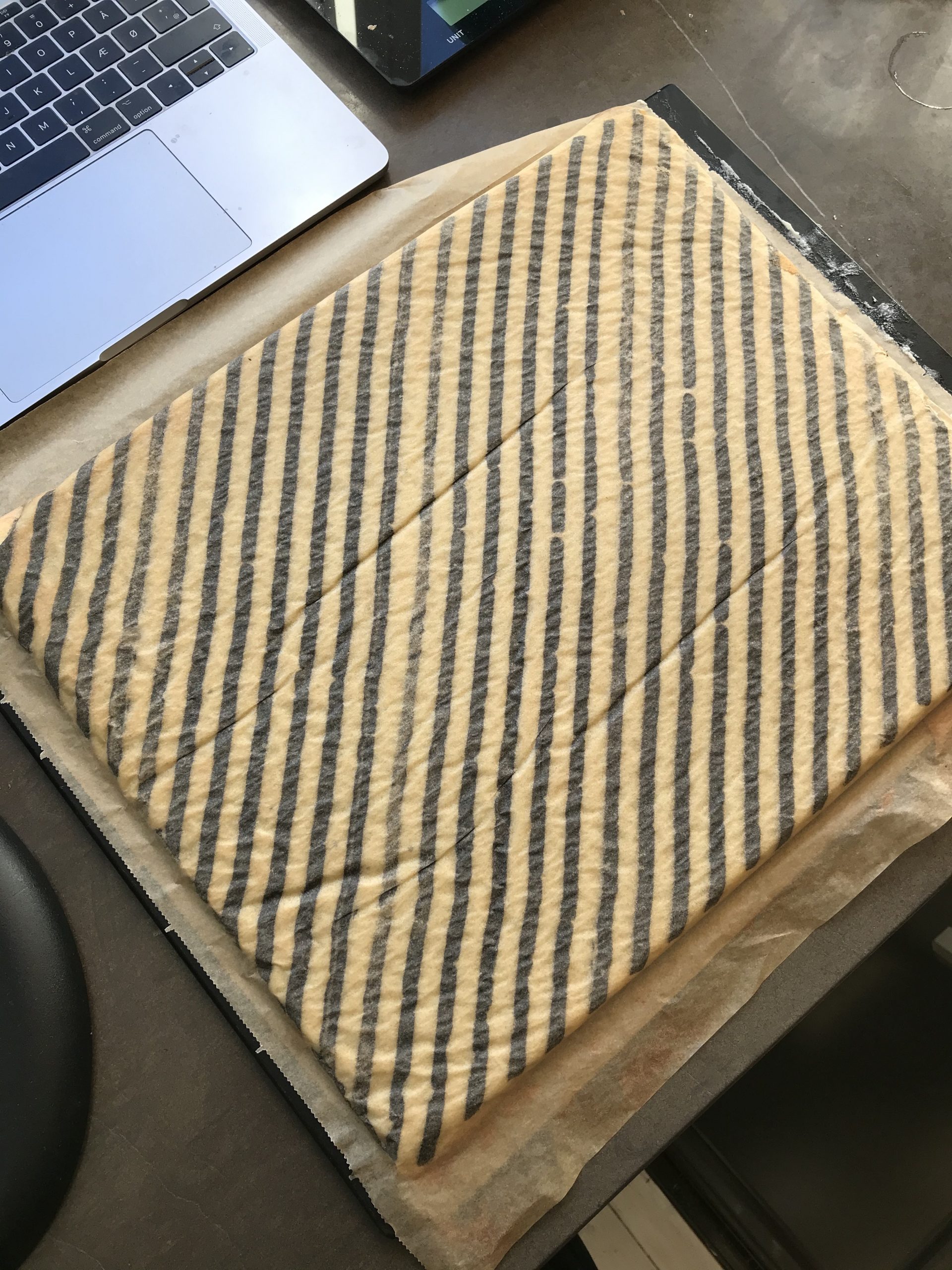Varm ovnen op til 175° varmluft. Pisk alle ingredienser, på nær pulverfarverne, sammen til en ensartet masse. Smør et tyndt lag dej ud på et stykke bagepapir på køkkenbordet – sørg for at komme helt ud til kanten. Lav striber i dejen ved at trække en kam skråt igennem dejen fra det ene hjørne til det andet – forsæt det stribede mønster over hele bagepapiret. Træk forsigtigt bagepapiret med dejen på over på en plade fra fryseren og sæt den på frost til dejen føles fast. Gem den resterende dej til tuile-figurer på toppen af kagen.