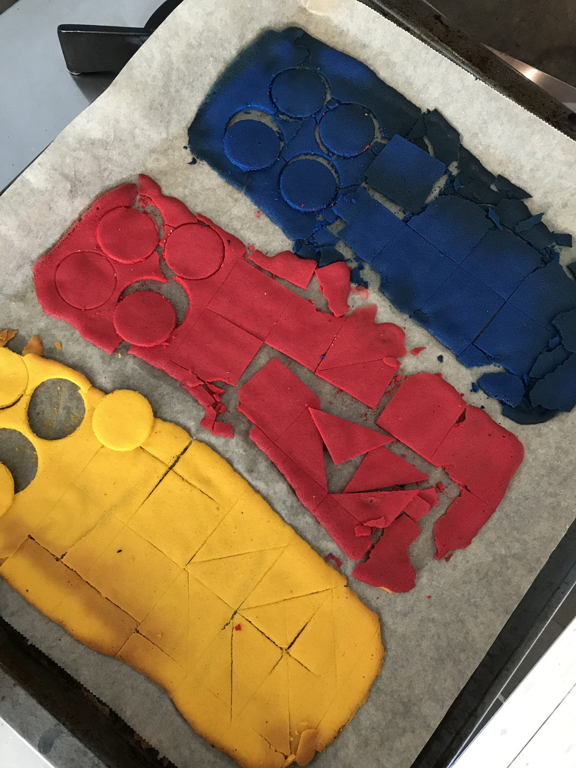 Del den resterende dej i 3 dele og farv dem rød, gul og blå med pulverfarverne. Smør dem ud i et tyndt lag på et stykke bagepapir på en bageplade og bag dem ved 175° varmlugt i ca. 8 min til dejen er gyldenbrun langs kanten. Udstik eller skær mens dejen endnu af varm og formbar de geometriske figurer og lad dem køle helt af og blive sprøde.