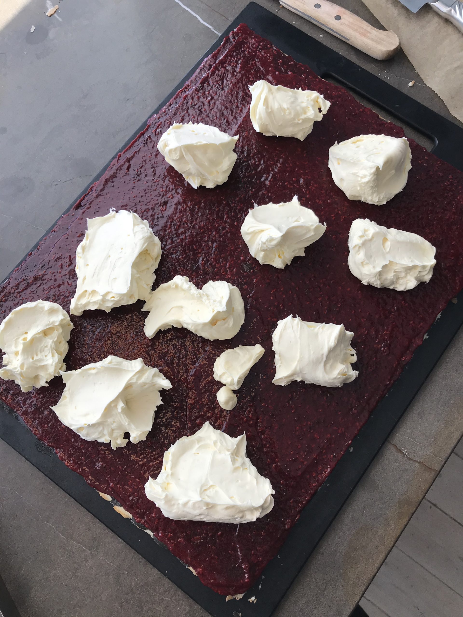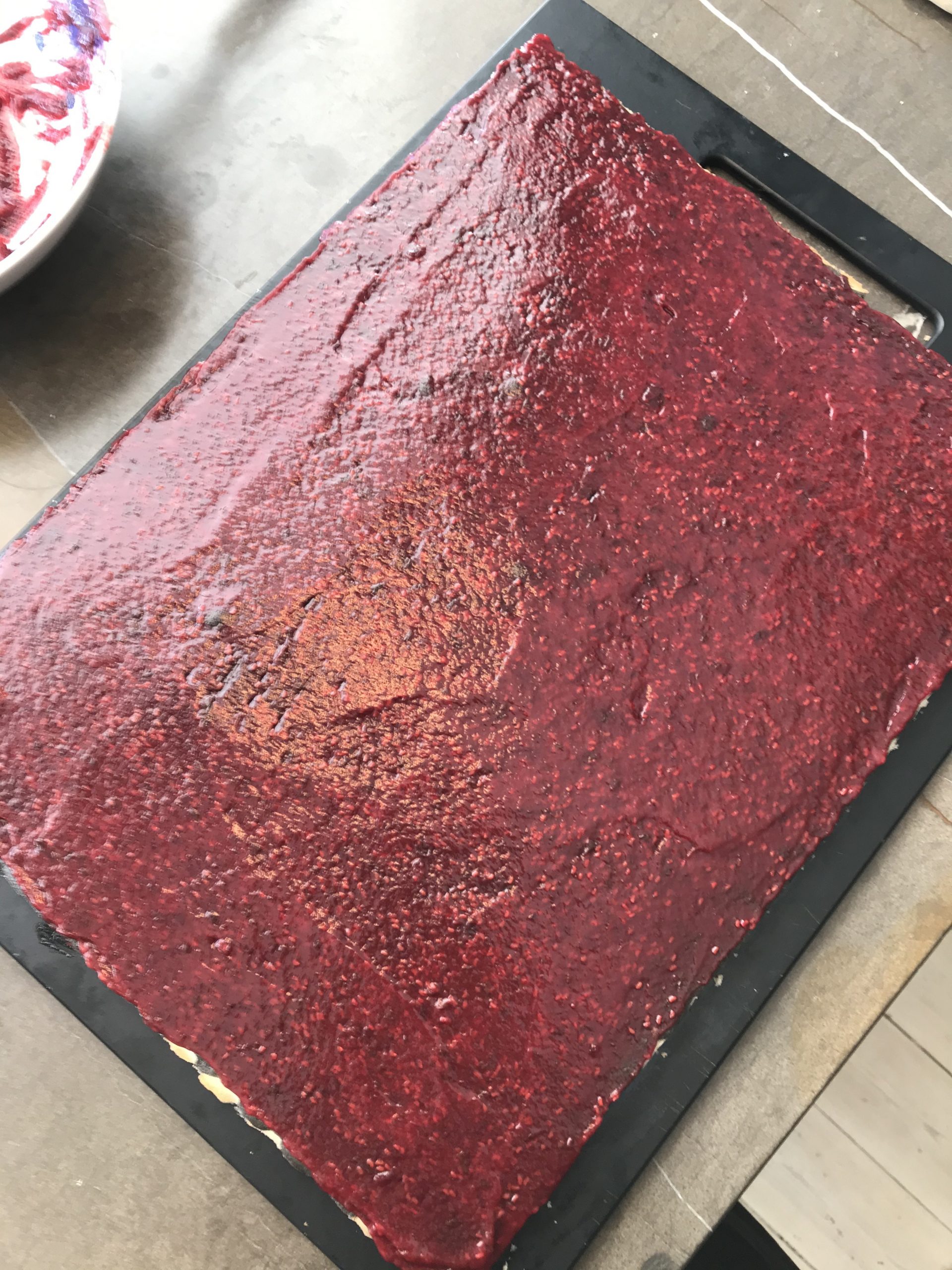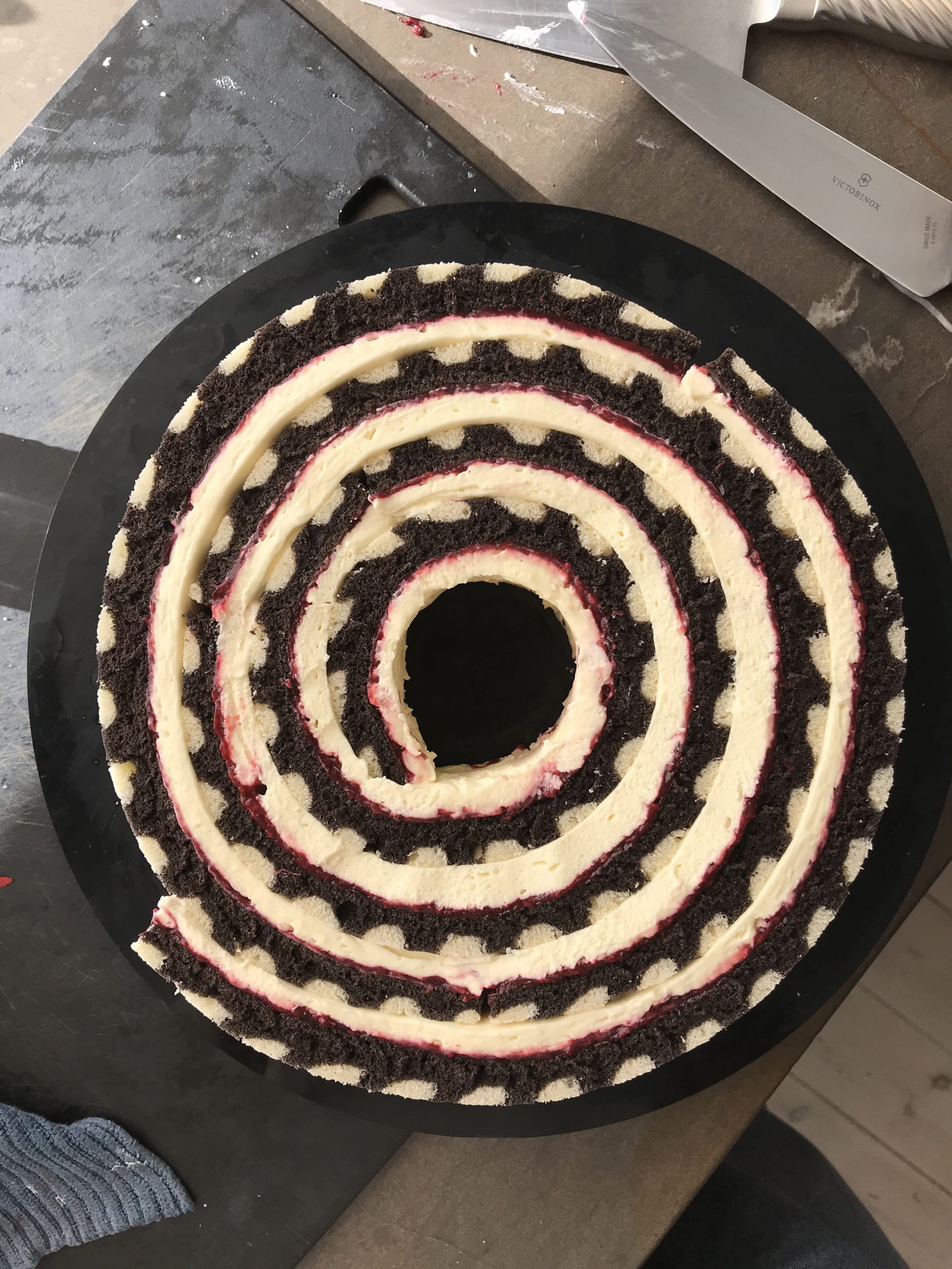 Pil bagpapiret af den afkølede bund og læg den på et skærebræt med et stykke rent bagepapir på med den stribede side mod papiret . Smør et tyndt lag hindbærmarmelade ud over hele bunden og sæt den kortvarigt tilbage på frost. Hæld den afkølede hvide chokoladecreme i en skål og pisk den luftig og fast. Pas på ikke at overpiske cremen, så den skiller. Smør nænsomt et lag creme ud over hele bunden på ca. 1 cm i tykkelsen. Sæt kortvarigt skærebrættet med kagen på frys, til cremen er fast. Sæt imens et lige glas med et stykke bagepapir omkring midt på serveringsfadet. Skær bunden på langs ud i 5 bånd med en bredde på ca. 5,5 cm og skær enderne lige af. Løft forsigtigt et bånd op og rul det omkring glasset på fadet med cremen indad. Sæt endnu et bånd i forlængelse af det første og forsæt med at rulle båndene omkring glasset. Sæt kortvarigt skærebrættet med kagen på frys, til kagen er gennemkoldt og fast. Pil herefter forsigtigt glasset og bagepapiret ud fra midten af kagen og glat cremen ud med en lille paletkniv. Pynt med tuile inden servering.